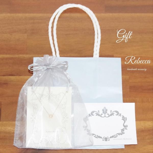 アクセサリーをオーガンジー袋で包装するほか、手提げの紙袋、メッセージカードをお付けします。