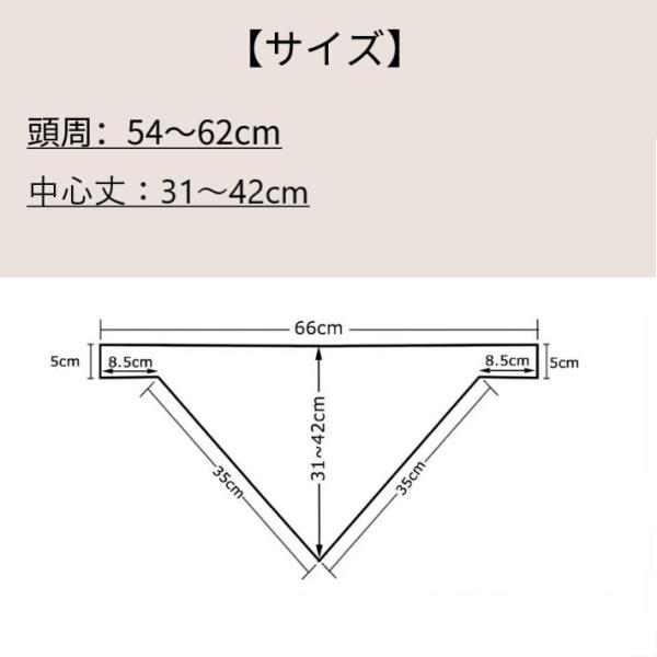 三角巾のフロント部分には三層の折り目を付けてあり、後頭部までの長さ調整もできるようにしてあります。プリーツが広がった状態と縮まった状態の画像で違いの確認が取れます。
