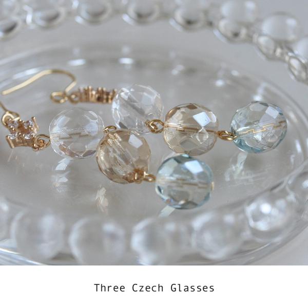 色合いの違うチェコガラスにはカットが入っていてキラキラと様々な表情を見せてくれます。写真で使用しているピアスフックはサージカルステンレス316Lです。他にも樹脂やチタンをお選びいただけるので、アレルギーがご心配な方にも安心してお使いいただけます。