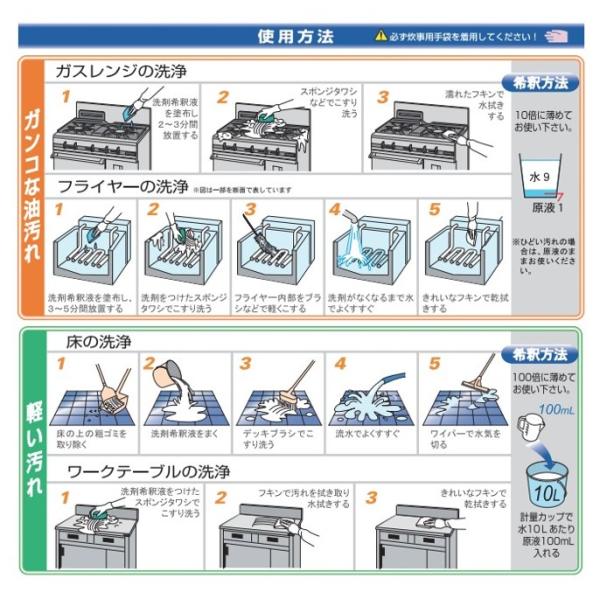 レンジやレンジ回り、厨房床、グリーストラップの洗浄に最適です。