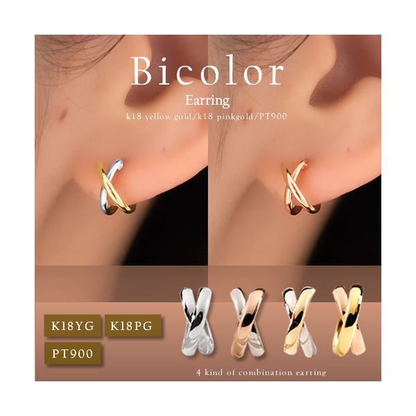ピアス レディース フープピアス 幅広 細 太 k18 18k 18金 PT900 ピンクゴールド プラチナ バイカラーピアス コンビカラー ミックスカラー キャッチレス