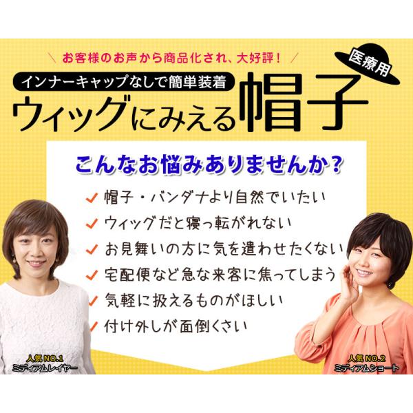 ウィッグに見える帽子 HAT06 ミディアムレイヤー フリーサイズ かぶるだけ おしゃれ 医療用かつら 円形脱毛症 抗がん剤 高品質 自然 脱毛症 白髪対応