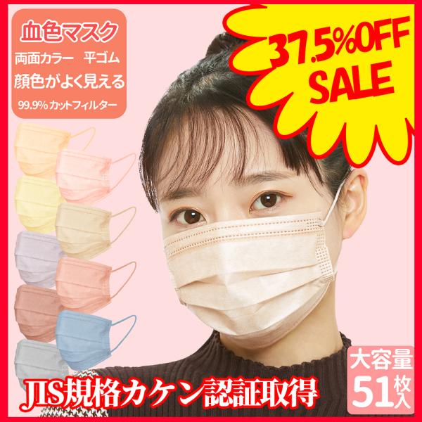 マスク 不織布 カラー 立体 不織布マスク 血色マスク カラーマスク 使い捨て 小さめ 小顔 普通 サイズ カラー カケン認証 mask おしゃれ 50+1枚