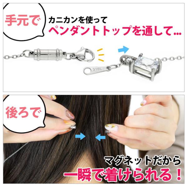 手元でペンダントをネックレスに通してから近づければ強力マグネットが勝手にくっつくので、