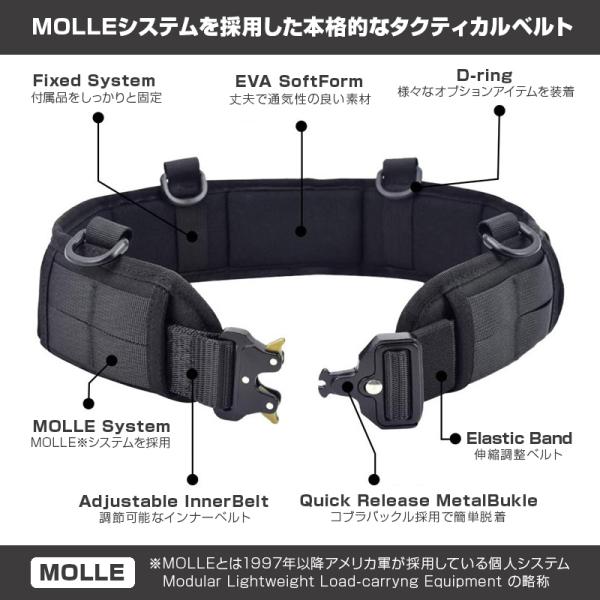 MOLLEシステムを採用したベルトはダンプポーチ、ホルスター、マガジンポーチなどを取り付ける事が可能。
