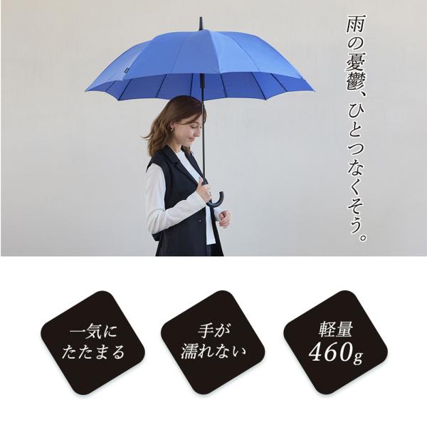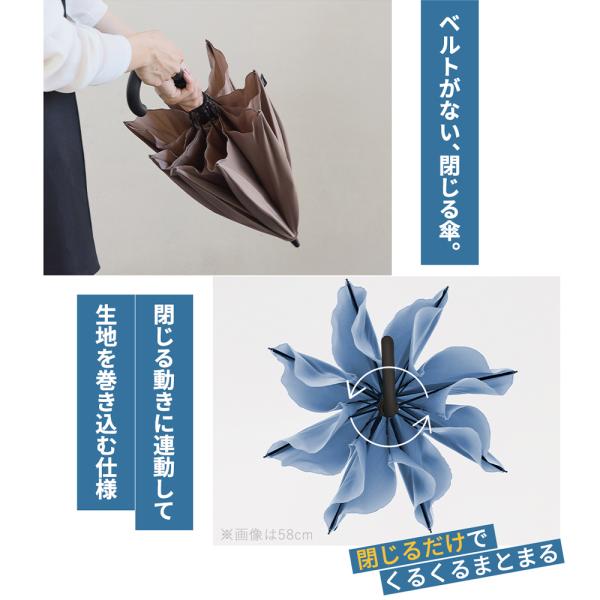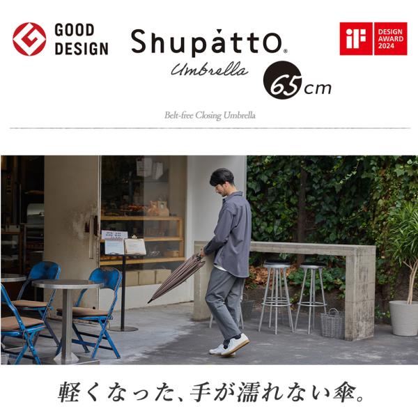 Shupatto アンブレラ(シュパット傘)は、ベルトがなく、とじるだけで一気にたためる新構造の傘。閉じる動きに連動して骨が回転し、生地をくるくると自動で巻き込むため、手でまとめたりベルトで留めたりする手間がありません。使いやすさはそのままに軽量化を実現し、持ち歩きの負担を軽減。さらにカラーバリエーションも一新し、より洗練されたラインアップに生まれ変わりました。スライダーを上げ下げするだけで開閉できるボタンレスロック方式を採用。ボタン操作不要でスムーズに開閉できます。また、中開き状態で固定できる乾燥用ストッパー機能付きで、使用後は立てたまま乾かすことが可能です。サイズは58cmと65cmの2種類。軽やかで持ちやすい58cmと、しっかり覆える安心サイズの65cmからお選びいただけます。UVカット率92.5%/UPF50+で晴雨兼用にも対応。折りたたみ不要・ベルト不要・ワンタッチ感覚でたためる、毎日使いたくなる機能的な一本です。