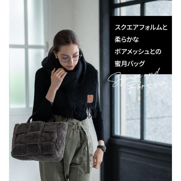●ふかふかの手触り良いボアで組まれた ワイドメッシュがさりげなくかわいい トートバッグ。