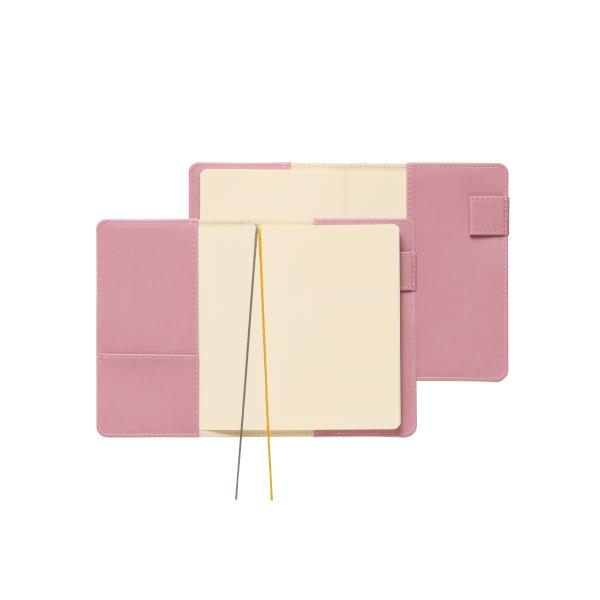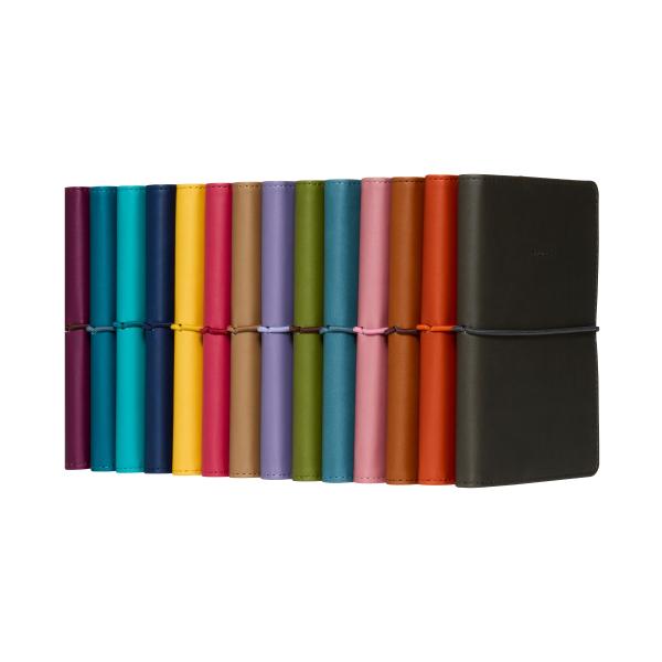 なめらかな質感のPU生地を使用した、ゴムバンド付きダイアリーです。裏地は生地を合わせて強度を高めています。ゴムバンドが付いているので、かばんの中で中紙が折れたり、挟んでいる付箋やメモが飛び出る心配もありません。直営店限定色はダークベージュ、ビビッドピンク、イエロー、ネイビー、ターコイズブルー、ブルーグリーン、パープルです。