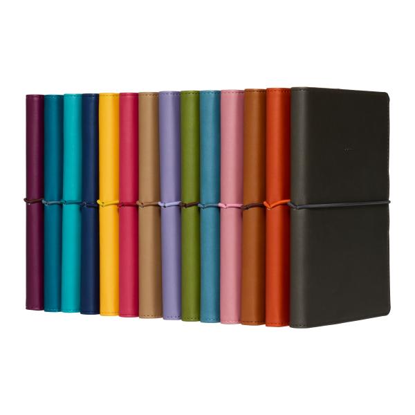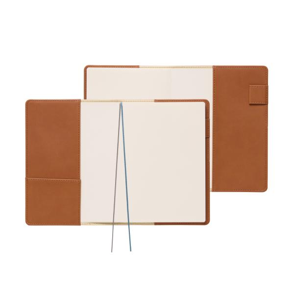 なめらかな質感のPU生地を使用した、ゴムバンド付きダイアリーです。裏地は生地を合わせることで強度を高めています。ゴムバンドが付いているので、かばんの中で中紙が折れたり、挟んでいる付箋やメモが飛び出る心配もありません。