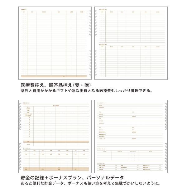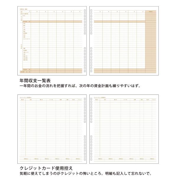 内容 : 月間集計表 / 月間収支 / 月別クリアポケット / 貯蓄の記録 / ボーナスプラン / 年間収支一覧表 / クレジットカード使用控え / 医療費控え / 贈答品控え / グリッドメモ / パーソナルデータ / 巻末収納ポケット / インデックスシート付き