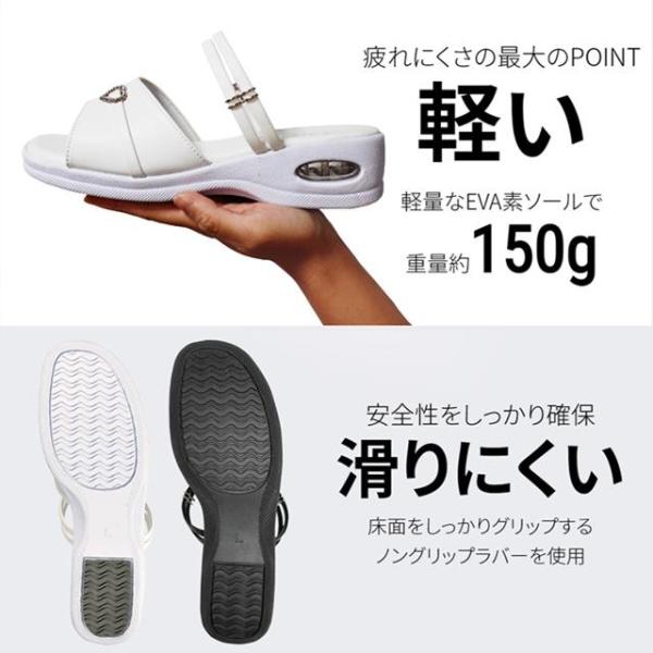 疲れや膝腰痛などの原因となる着地の衝撃。それを吸収するエアーパーツを標準搭載したアンファミエオリジナルデザインサンダル。
