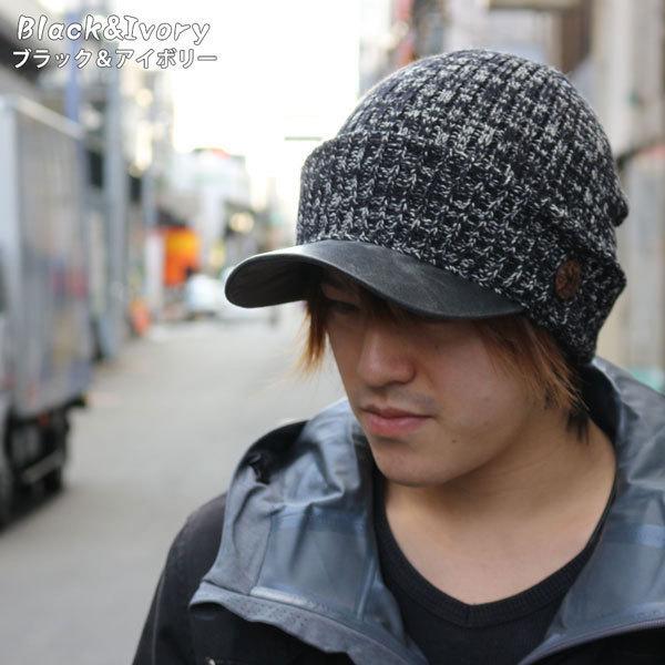 このニットキャスケットは、ニットとアンティーク合皮とボタンの組み合わせが