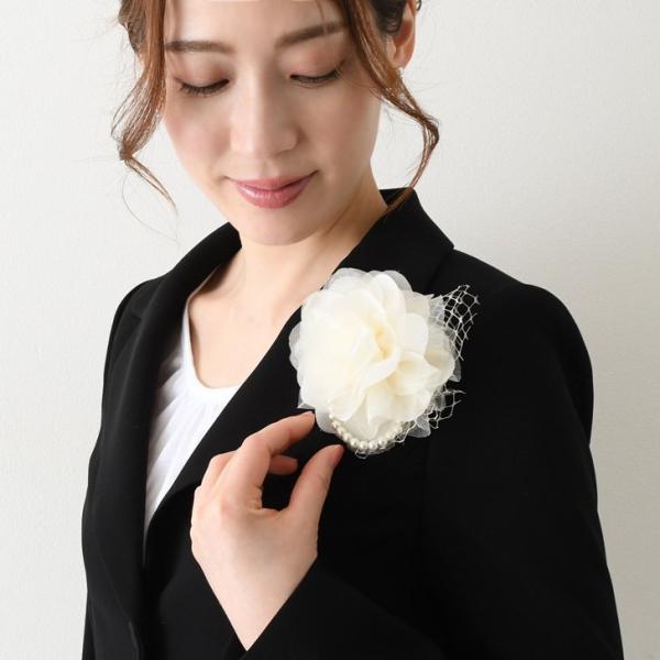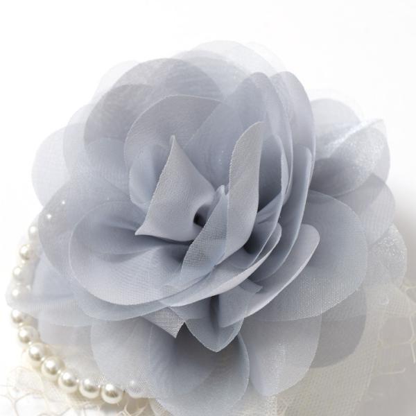 オーガンジー素材のふんわりとしたフラワーモチーフが上品なコサージュ