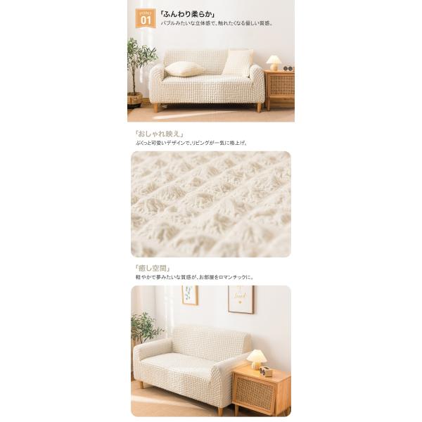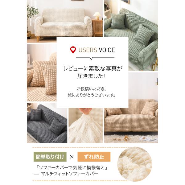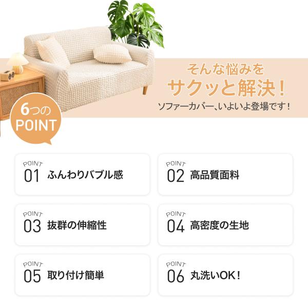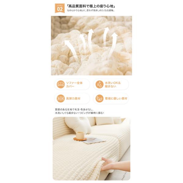 すべり止めスティック付きで、座ってもズレにくい安定感。ソファ全体を包み込む設計なので、子どもやペットがいても安心です。