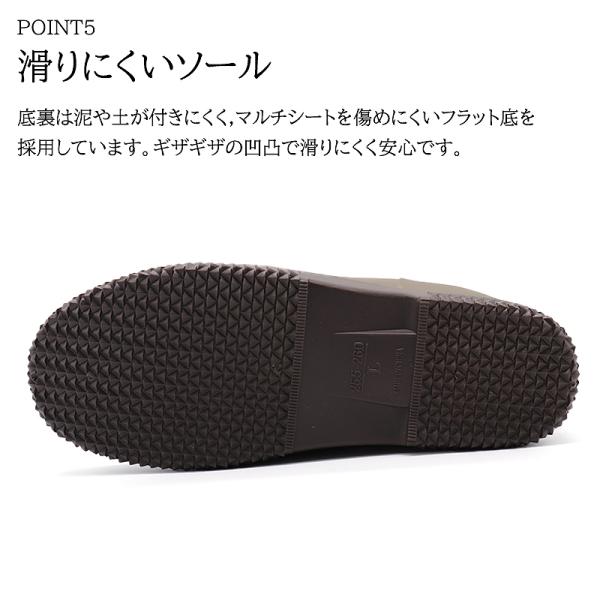 底裏は泥、土が付きにくく、マルチシートを傷めにくいフラット底を採用。ギザギザの凹凸で滑り難く安心。