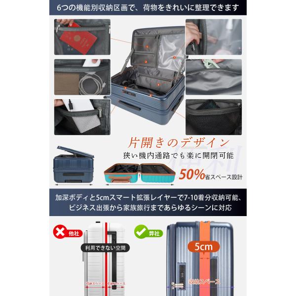 最新式デザイン!スーツケース フロントオープン 片開き キャリーバッグ 機内持ち込み USBポート付き ドリンクホルダー スマホスタンド キャリーケース 静音