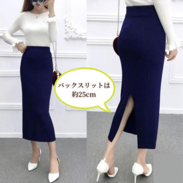 タイトスカート ロングスカート ニット 秋冬 無地 リブニット 黒 ウエストゴム スリット 80cm丈