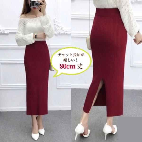 タイトスカート ロングスカート ニット 春 秋冬 無地 マキシ丈 黒 ウエストゴム スリット 赤 30代 40代 50代