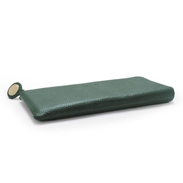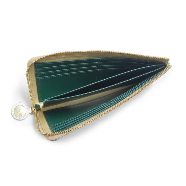 L字型にファスナーが開くフェリーチェLはすっきりとしたマチが特徴で、金と緑の配色も相まって、手元をスタイリッシュに装います。素材には、傷のつきにくい牛革シュリンクレザーを贅沢に使用しました。