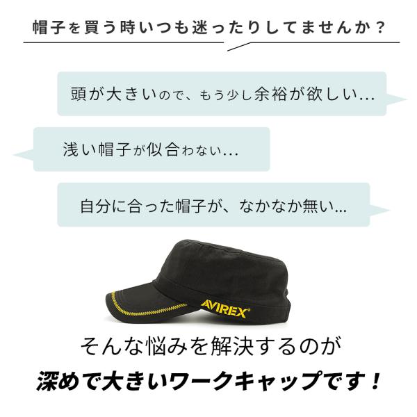 ワークキャップ メンズ キャップ 大きいサイズ アビレックス AVIREX ミリタリーキャップ アヴィレックス 帽子 ツバ長 つば長 つば広 レディース 送料無料 男性 女性 2サイズ 58cm 63cm 大きめ 深め ブランド コットン ゴルフ
