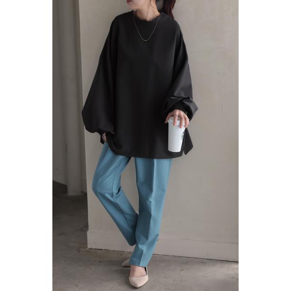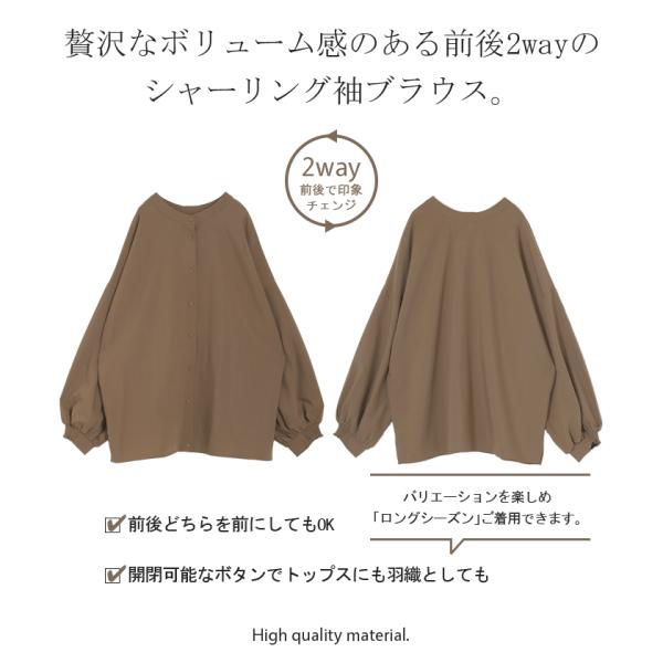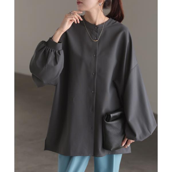 シャツ ブラウス ロング レディース トップス アウター ボリュームスリーブ ノーカラー スタンドネック