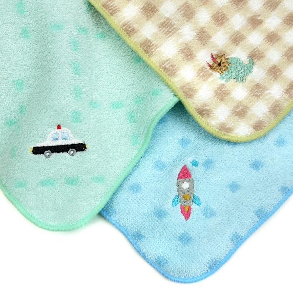 ループ付きタオル ハンドタオル 綿100% 3枚セット ジャカード柄 ワンポイント 刺繍 水玉 チェック リボン パトカー ロケット 恐竜 うさぎ チェリー 男子 女子