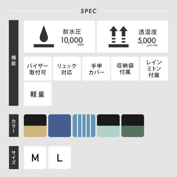 雨の日の自転車にオススメのリュック対応レインポンチョです。メンズ、レディース問わず着用頂けるおしゃれなデザインで、M/Lサイズの2サイズ展開。小さめリュックなら背負ったままで着用頂けます。※大きいサイズのリュックは使用できない場合がございます。フロント部分のファスナーは全開閉できて、急な雨の時もレインコートのようにさっと羽織って着用できます。耐水圧10,000mm、透湿度5,000gと軽量で薄手の防水透湿生地を採用し、しっかりと雨を防ぎつつ内部の蒸れを外に逃がして蒸れにくくなっています。雨の日はもちろんアウトドアやレジャー、屋外イベントの時などに着用頂ける明るいカラーの3色をご用意。男女兼用のM/Lの2サイズ展開で、身長や用途に合わせて着用いただけます。袖口には手の冷え防止用の手甲カバー付き。更に、レインポンチョと同生地のレインミトンが標準で付属していて、袖口にレインミトンの落下防止用スナップボタンが付いています。収納袋は大きなサイズで着用後も入れやすく、トートバッグ型で肩掛けができて持ち運びに便利です。フード部分にバイザーシステムを搭載しているので、別売りのレインバイザーの取付けが可能です。