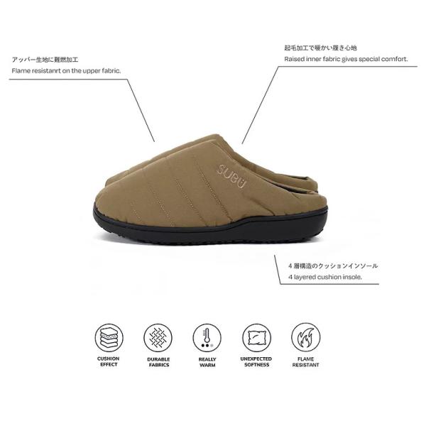 通常のSUBUが焚火などの火の粉が原因で穴が開いてしまったというお客様の声からアウトドア仕様にアップデート。難燃性のCORDURA305D素材をアッパーに使った、アウトドアやキャンプシーンに最適の一足。ダウンのような暖かさで、素足をつつみ込み、起毛加工の内側の記事と4層構造のインソールが、足全体に抜群のフィット感を生み出し、優しい履き心地をつくりだします。同素材&同色の収納ケースが付属されています。