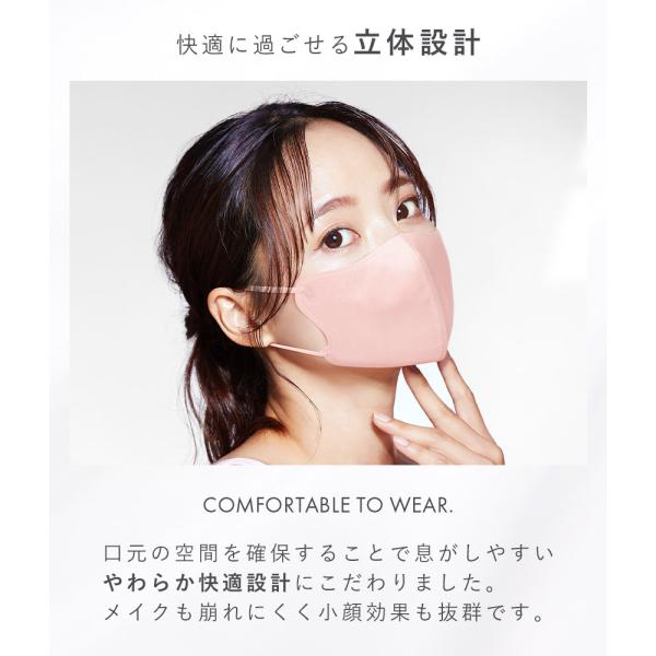 顔周りのラインがキレイに見える立体2D型の不織布マスク。フェイスラインにフィットして顔を小さくスッキリと見せてくれます。また、薄くて軽い付け心地も魅了。口元に空間ができる立体構造で息がしやすくベタつきにくいにので長時間の使用でも快適です。不織布は安心の3層構造でVFE/BFE/PFE 99%遮断。流行性のウィルスや花粉をしっかりブロックしてくれます。耳ひもは痛くなりにくい柔らか平紐を使用。細めのタイプでスッキリとしたデザインです。